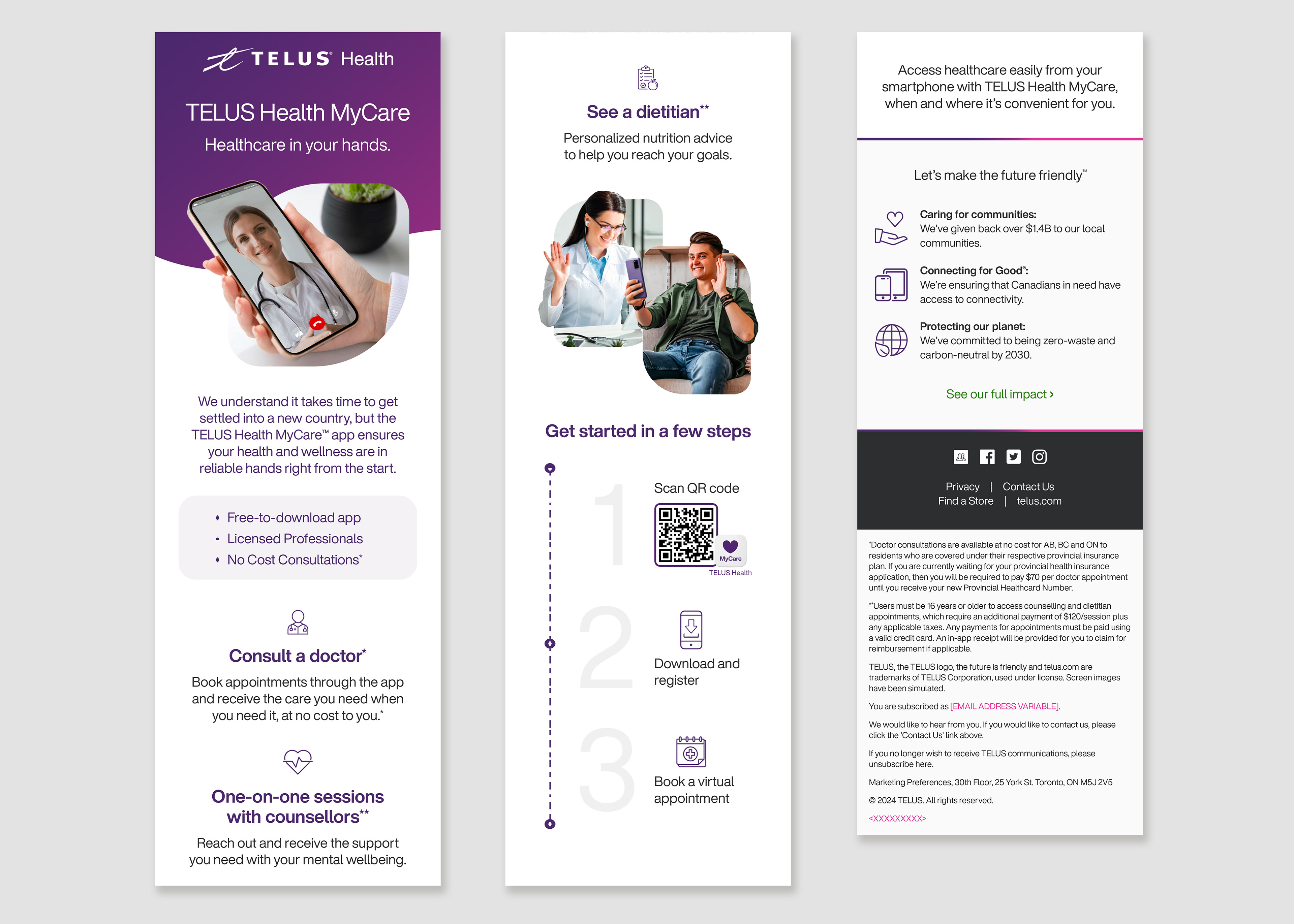 TELUS Health launched an email and MMS campaign to promote the MyCare app to newcomers across Canada. With the shortage of family doctors, and the added challenge newcomers face in finding one, the campaign aimed to highlight how the app makes it easier to connect with a doctor virtually, right from the phone.